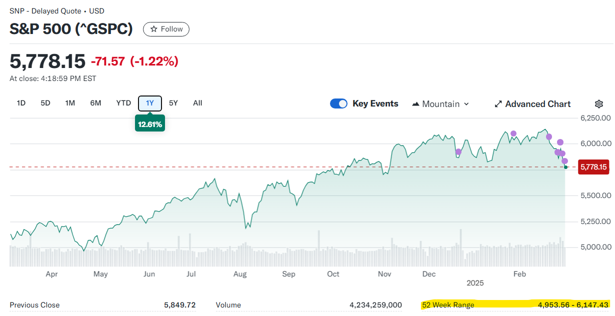 위에 보이는 그래프와 같이 지난 2월 19일부터 S&P500는 하락 중입니다. 한 달 사이 무려 -4.30% 하락하는 모습을 보여주고 있습니다. 그런데 그래프 오른편 아래쪽에 노란색으로 표시한 부분을 보시면 지난 52주(1년) 동안 S&P500의 가격 변동을 볼 수 있습니다.