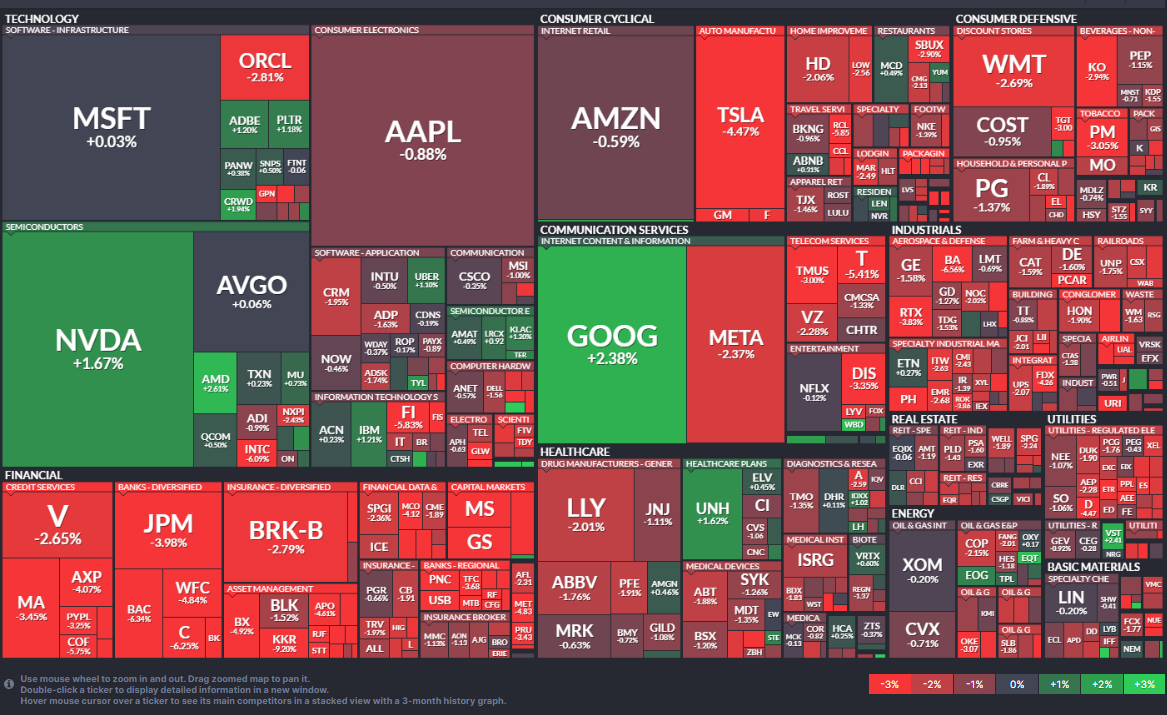 트럼프의 관세 정책이 발표된 이후 금융(XLF), 소비재(XLY), 산업(XLI) 등 11개 주요 섹터가 모두 하락했습니다. 특히 금융 부문은 3% 하락하며 가장 큰 타격을 입었습니다. 소비재 및 산업 부문도 각각 1.5%, 1.4% 하락했습니다.