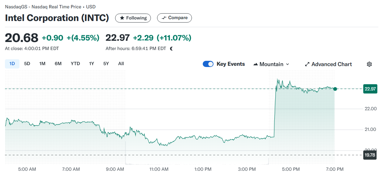 인텔 주가는 시간 외 거래에서 11% 이상 급등했습니다. 이번 소식은 TSMC(TSM)가 주도하고 엔비디아(NVDA)와 브로드컴(AVGO)이 참여하는 컨소시엄이 인텔의 제조 사업 인수를 논의 중이라는 로이터 통신 보도와 같은 날 나온 것입니다.