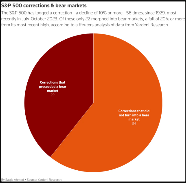 Ryan Detrick 같은 전문가들은 현재의 조정이 베어마켓으로 이어질 가능성은 낮다고 보고 있습니다. 역사적으로 볼 때, 조정의 75%는 베어마켓으로 발전하지 않았습니다.